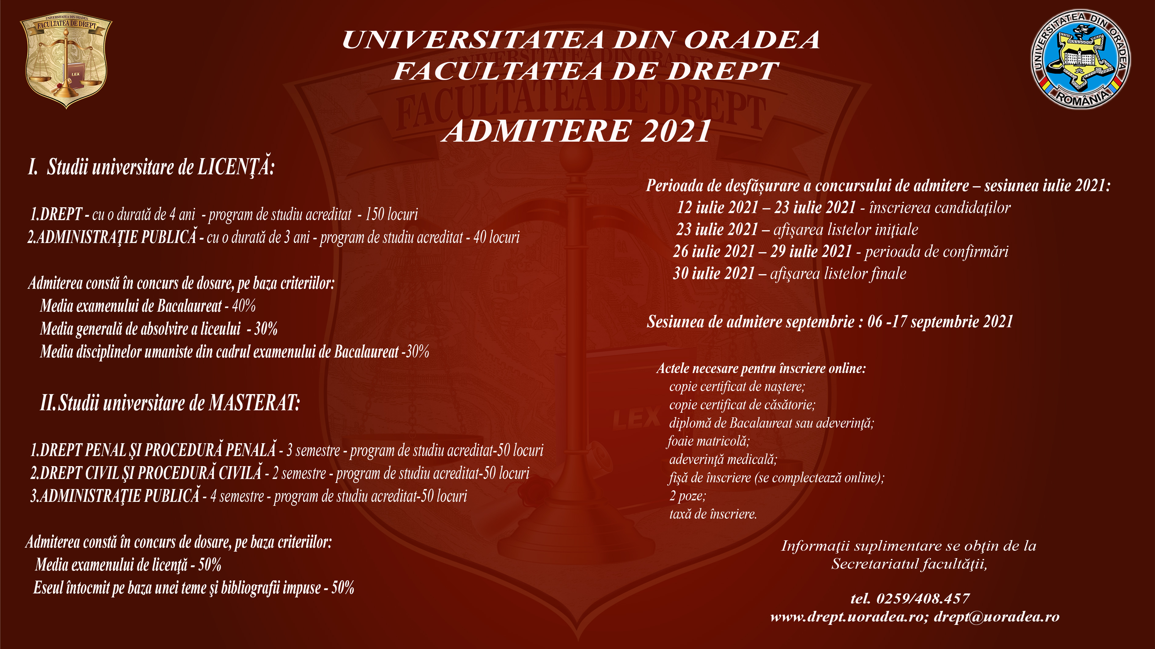 Ținând cont de contextul actual, care nu ne permite derularea de activități ”față în față” cu elevii (de tipul ”Caravanei admiterii”sau a ”Zilelor porților deschise”) vă comunicăm oferta educațională pentru ADMITEREA 2021 a facultății noastre.Vă invităm să participați la evenimentul ”FACULTATEA DE DREPTÎN DIRECT!”– o prezentare interactivă a facultății, a programelor de studiu și a activităților noastre.