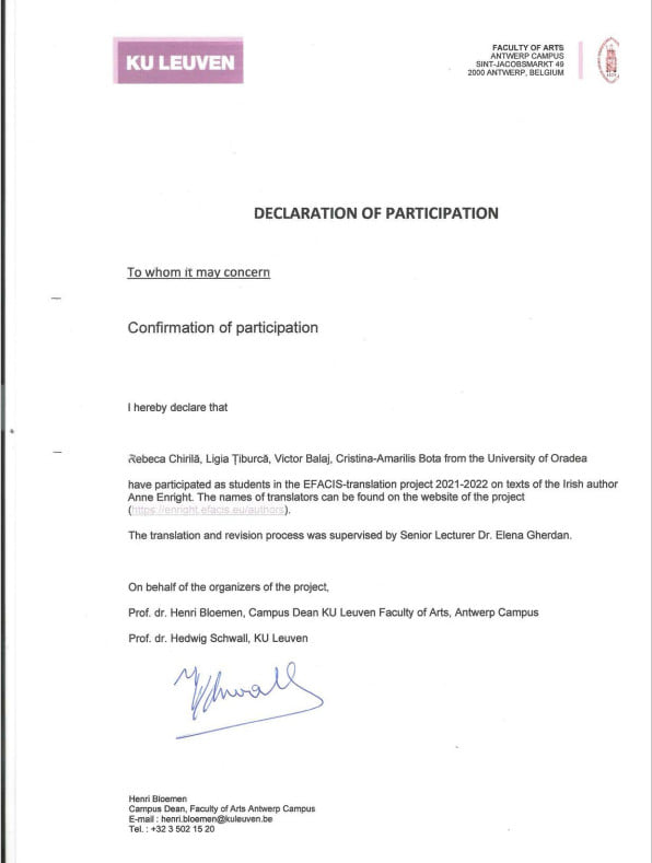 În cadrul acestui proiect, studenți de la mai multe universități din România au avut de tradus din textele autoarei irlandeze Anne Enright. Cea care i-a încurajat și coordonat pe studenții orădeni, lect. univ. dr. Maria Elena Gherdan, spune că participarea acestora la concursul internațional de traduceri a fost un „succes”. „Am fost entuziasmați de invitația pe care am primit-o din partea colegilor noștri din Timișoara. E o mare diferență între a face traduceri la cursuri, unde profesorul îți spune, poate, că ești bun, și a pătrunde efectiv în breasla traducătorilor”. Ca rod a participării lor la această competiție internațională, cei patru studenți orădeni au primit un certificat care, spune lect. univ. dr. Maria Elena Gherdan, la va fi util, dacă vor decide să lucreze în domeniul traducerilor și al interpretariatului. „Pe scurt, de acum înainte, vor putea spune că au deja un portofoliu”. Nu în ultimul rând, participând la astfel de proiecte, studenții „înțeleg cum se poate pune în practică ceea ce învață la facultate. Astfel de provocări le arată că se poate, sunt un fir roșu, pe care poți să mergi, construindu-ți o carieră”, spune lect. univ. dr. Maria Elena Gherdan.