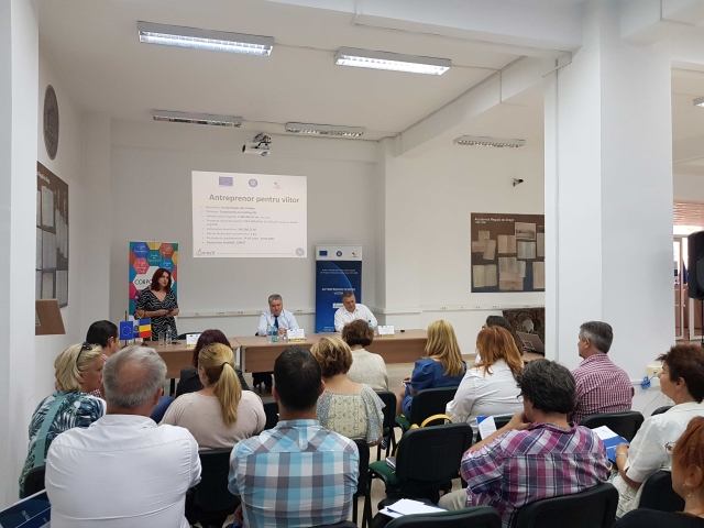 În continuare, domnul Aurel Căuş, a prezentat activitățile proiectului, rezultatele aşteptate în urma implementării proiectului, precum şi site-ul proiectului http://antrev.uoradea.ro, platforma de comunicare utilizată în cadrul proiectului https://e.uoradea.ro şi instrumentele social media utilizate în promovarea proiectului: Facebook – Pagina Antreprenor pentru viitor şi Instagram: proiect_AntreV.