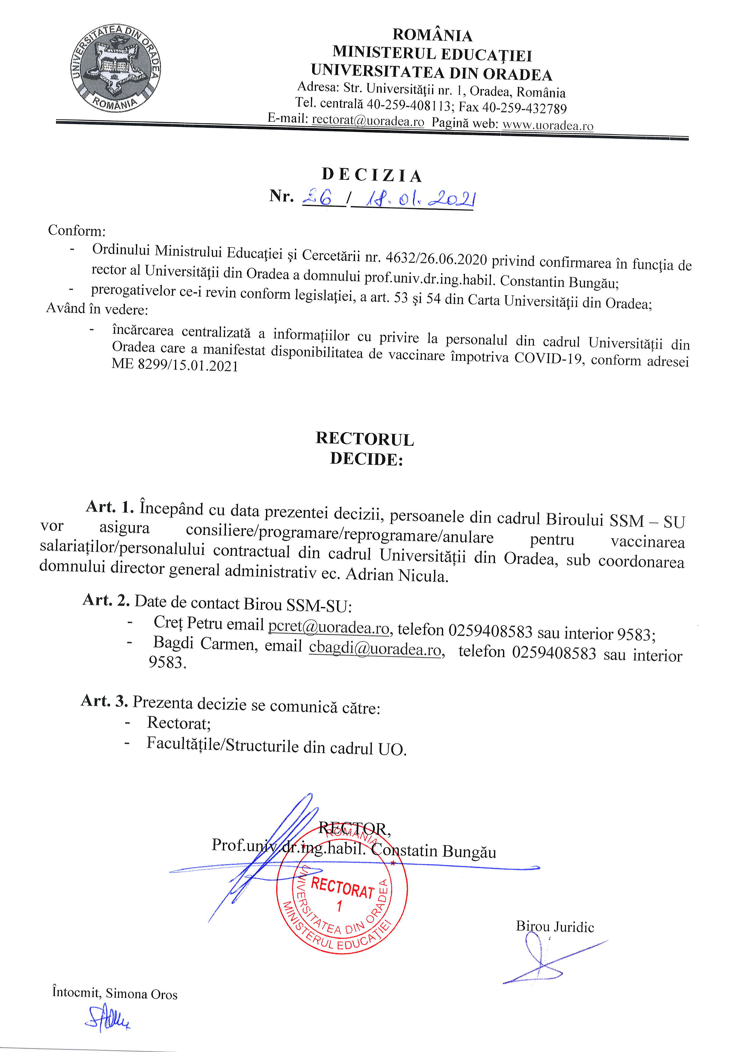Începând cu data de 18.01.2021, persoanele din cadrul Biroului SSM_SU vor asigura consiliere /programare/reprogramare/anulare pentru vaccinarea salariaților/personalului contractual din cadrul Universității din Oradea, sub coordonarea domnului director general administrativ ec. Adrian Nicula. Date de contact Birou SSM_SU:Creț Petru, email: pcret at uoradea.ro, telefon 0259408583 sau interior 9583 și Bagdi Carmen, email: cbagdi at uoradea.ro, telefon 0259408583 sau interior 9583. |