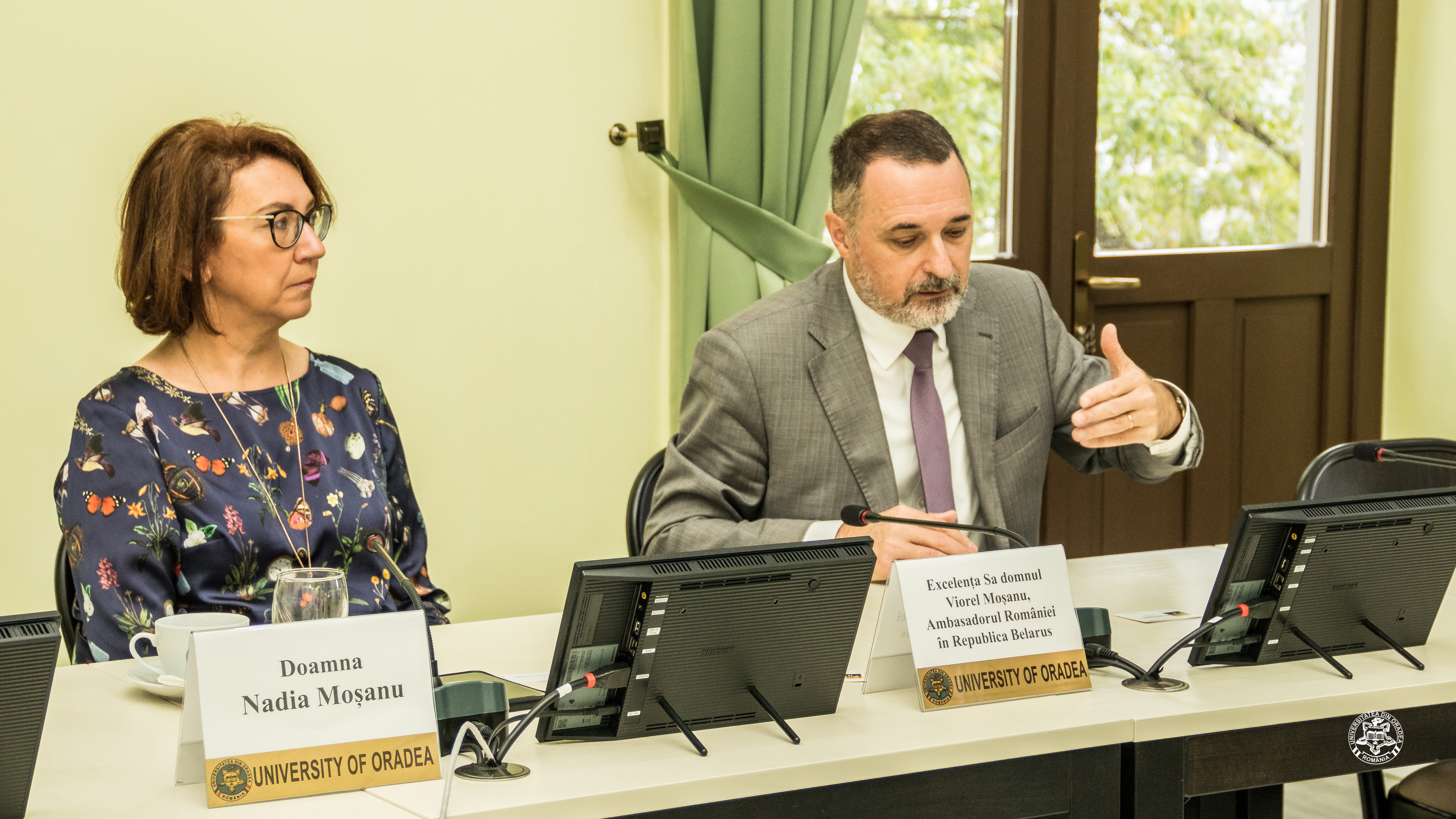 Impresionat de prezentarea făcută, Excelența Sa domnul Viorel Moșanu, ambasadorul României în Belarus, a spus că, în condiții normale, ar fi venit la Universitatea din Oradea pentru a strânge relațiile academice dintre cele două țări. „Dar, din nefericire, în țara în care îmi îndeplinesc misiunea diplomatică lucrurile au deraiat periculos. De un an de zile, țara este într-o criză politică internă gravă. Este o dramă, fiindcă nu credeam că vom fi martorii unei asemenea degradări a situației într-o țară profund europeană”. Excelența Sa domnul Viorel Moșanu, al cărui discurs a fost pregnant marcat de starea critică din țara condusă de Aleksandr Lukașenko, a pus criza politică pe seama „dorinței de a rămâne la putere, cu orice preț”. Ambasadorul român a afirmat că regimul de la Minsk a decapitat societatea civilă și că represiunea a fost atât de eficientă încât, practic, mișcarea de protest, declanșată acum un an, a dispărut. „În acest moment totul s-a năruit. Mai mult decât atât, rectori au unor universități belaruse au participat la represiunea propriilor studenți”, a spus Excelența Sa domnul Viorel Moșanu. Soția sa, Nadia Moșanu, a detaliat: „Și-au pârât studenții fiindcă cântau cântece de protest pe holurile universităților”. S-au făcut numeroase arestări și, după cum spune Excelența Sa domnul Viorel Moșanu, la Minsk, s-a pus la care un proces model menit să discrediteze mișcarea studențească și să demonstreze că studenții sunt manipulați dinafară. Doar pentru că au cântat cântece îndreptate împotriva regimului Lukașenko, câteva zeci de studenți beloruși au fost condamnați la doi ani și jumătate de închisoare, alții au fost exmatriculați, unii au plecat la studii în Polonia, Lituania sau Germania.