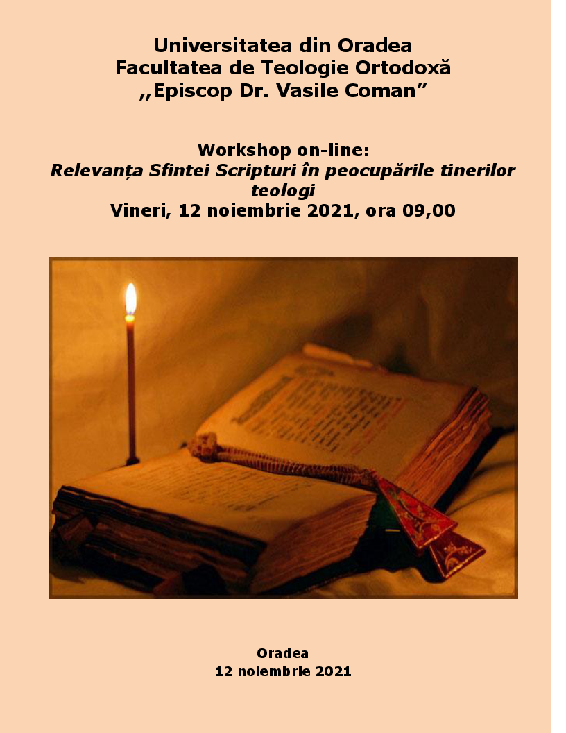 În acest sens, cu binecuvântarea Preasfințitului Părinte Sofronie, Episcopul Oradiei, Facultatea de Teologie Ortodoxă ,,Episcop Dr. Vasile Coman” a Universităţii din Oradea organizează, vineri, 12 noiembrie 2021, ora 09,00, workshop-ul cu tema: Relevanța Sfintei Scripturi în peocupările tinerilor teologi.