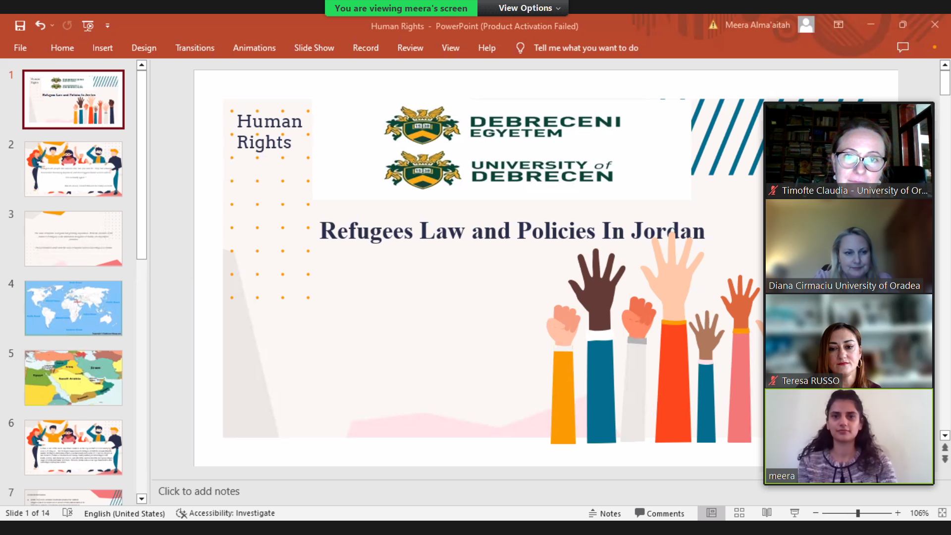 După momentul de deschidere oficială, conferința și-a continuat parcursul științific în limba engleză pe secțiuni, după cum urmează: secțiunea I - Human rights in the context of war menace, secțiunea II - Rights and freedoms. Protection of people with special needs, secțiunea III - Human rights and new technologies. Opportunity or threat?