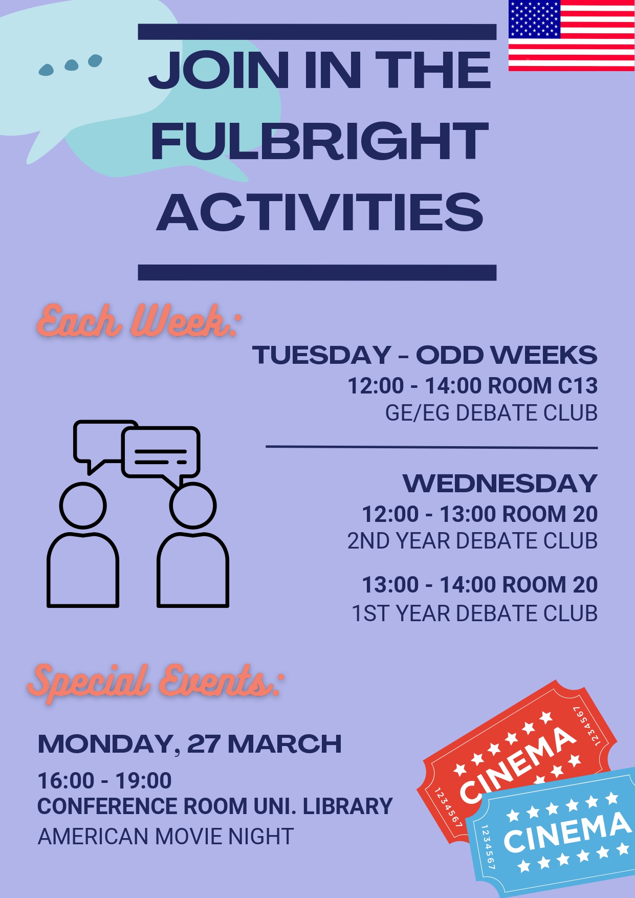 „Clubul de dezbateri se adresează tuturor studenților interesați. Aici se exersează comunicarea asertivă și argumentativă pe o varietate de subiecte, cum ar fi mentalitatea incluzivă, energia nucleară, utilizarea materialelor plastice sau drepturile animalelor etc. «Serile de film american din campus» includ, pe lângă vizionare, o discuție de grup și explicații asupra contextului cultural pentru fiecare film. Așteptăm cu interes participarea tuturor studenților Universității din Oradea”, transmite decana Facultății de Litere a Universității din Oradea, conf. univ. dr. Veronica Buciuman.