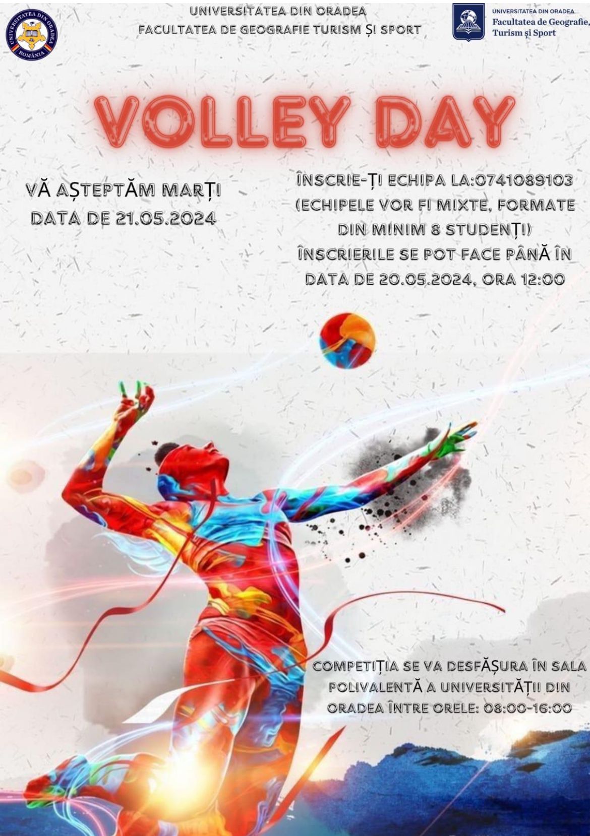 „Volley Day”, ediția 2024, s-a desfășurat marți - 21 mai, în sala Polivalentă a Universității din Oradea. Evenimentul a avut parte de o participare numeroasă. Peste 120 de studenți, de la Facultatea de Geografie, Turism și Sport, s-au înscris la concurs și au evoluat pe teren, grupați în 12 echipe mixte.
