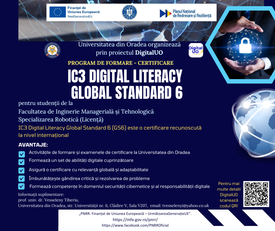 IC3 Digital Literacy Global Standard 6 (IC3-GS6) este o certificare recunoscută la nivel internațional care formează abilități digitale avansate. IC3-GS6, este cea mai recentă versiune a programului IC3 Digital Literacy, oferă concepte actuale de calcul, inclusiv tehnologiile cloud și mobile. Acest program de formare se concentrează pe fundamentele de calcul, comunicarea digitală, crearea de conținut și securitatea cibernetică, oferă studenţilor posibilitatea de a-şi forma capacitatea de selecţie şi utilizare a celor mai adecvate instrumente de cercetare, de îmbunătăţire a productivităţii, de colaborare și comunicare, de a identifica informații fiabile, de a crea conținut, de a comunica în siguranță și de a utiliza eficient mediile digitale moderne.