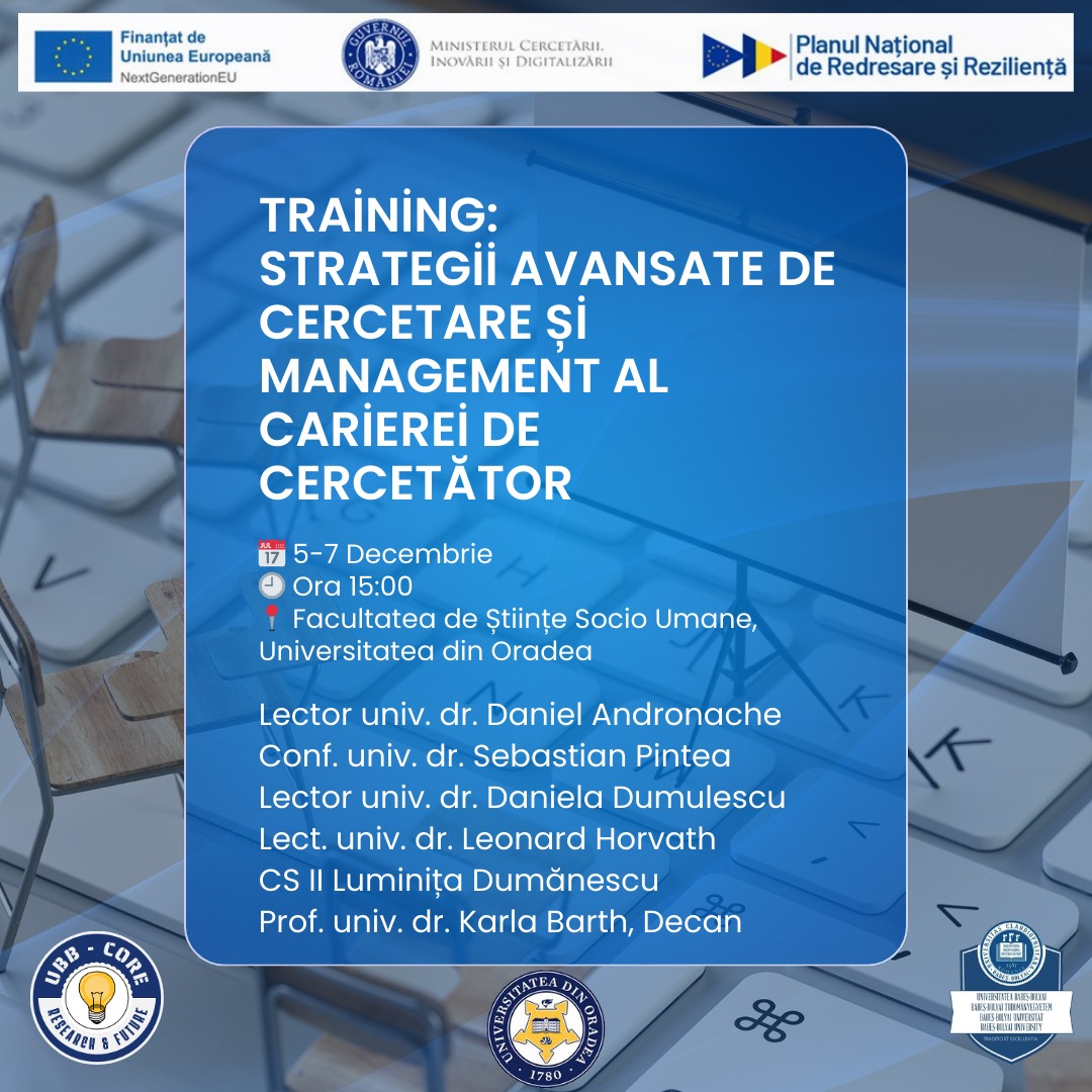 Evenimentul, intitulat: „Strategii avansate de cercetare și management al carierei de cercetător”, se desfășoară în cadrul proiectului „Centrul Regional Nord-Vest de Orientare în Carieră al Cercetătorilor (UBB-CORE)/Center for Orientation in the Research Career of the Nord-West Region/(UBB-CORE)”.