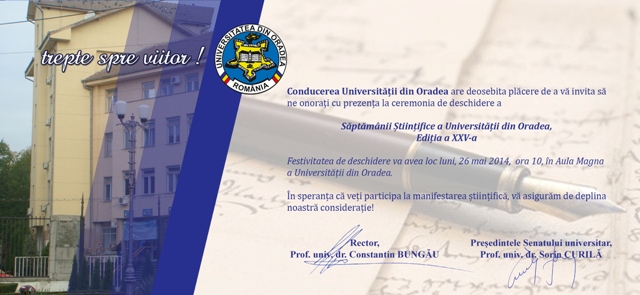 Conducerea Universităţii din Oradea are deosebita plăcere de a vă invita să ne onoraţi cu prezenţa la ceremonia de deschidere a Săptămânii Ştiinţifice a Universităţii din Oradea, Ediţia a XXV-a. Festivitatea de deschidere va avea loc luni, 26 mai 2014, ora 10, în Aula Magna a Universităţii din Oradea.