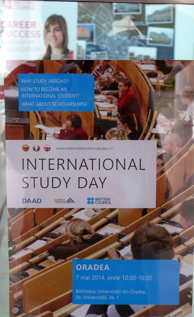 Pe durata acestei zile, reprezentanţii celor trei instituţii s-au aflat în Sala de Conferinţe a Bibliotecii UO cu standuri special amenajate şi au realizat prezentări interactive despre studiile în străinătate, sesiunile de informare pentru studenţii aflaţi în anii terminali şi absolvenţii de studii universitare interesaţi de doctorate şi masterate în străinătate.