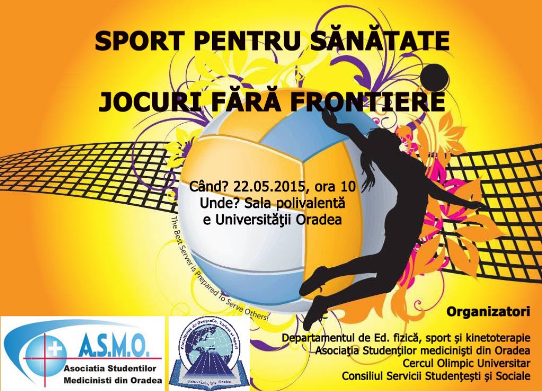 Departamentul de Educaţie Fizică, Sport şi Kinetoterapie din cadrul Facultăţii de Geografie, Educaţie Fizică şi Sport împreună cu Asociaţia Studenţilor Medicinişti din Oradea, Cercul Olimpic Universitar, Consiliul Servicii Studenţeşti şi Sociale organizează evenimentul "Sport pentru sănătate. Jocuri fără frontiere". Activitatea sportivă va avea loc vineri, 22 mai 2015, de la ora 10 în Sala Polivalentă a Universităţii din Oradea. Sunt aşteptaţi să participe la competiţii toţi studenţii de la toate profilele.
