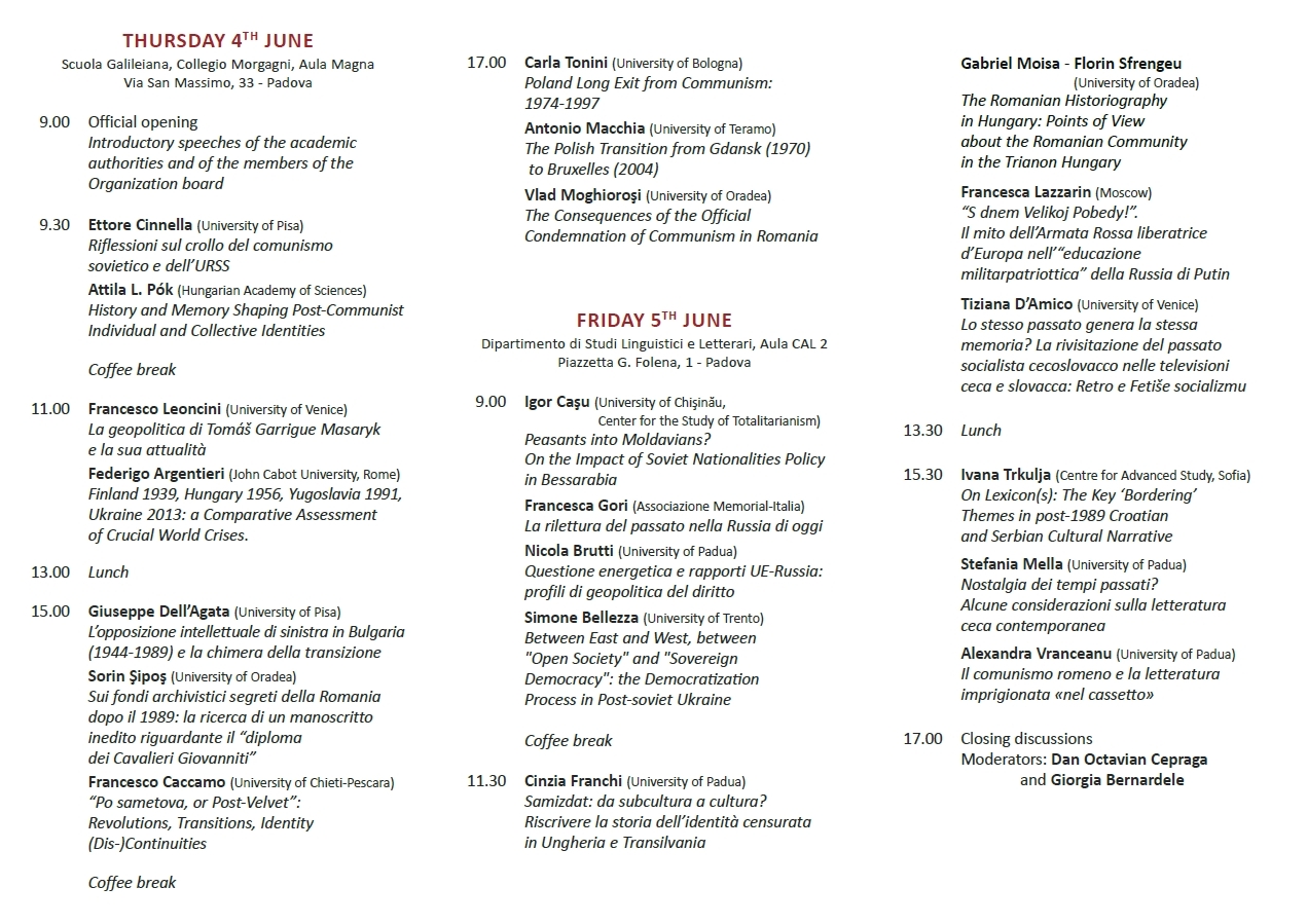 Centrul de Studii Interdisciplinare de la Universitatea din Oradea are o colaborare științifică îndelungată cu Departamentul de Studii Lingvistice de la Universitatea din Padova. Până în acest moment au fost organizate 7 manifestări științifice comune și au fost publicate 5 volume care cuprind lucrările prezentate la sesiunile comune. În această săptămână, o delegație a Centrului de Studii Interdisciplinare de la Universitatea din Oradea, formată din prof.univ.dr. Sorin Șipoș, prof.univ.dr. Gabriel Moisa, lector univ.dr. Florin Sfrengeu și studentul masterand Vlad Moghioroși, participă la Simpozionul Internațional "Post-Communism and Identities: East-European Perspectives" organizat din Universitatea din Padova între 4 și 5 iunie 2015. La simpozion participă specialiști din Italia, Federația Rusă, Bulgaria, Ungaria și Republica Moldova.