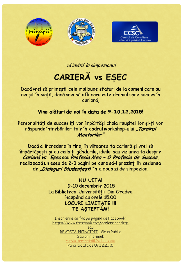 Așadar vă asteptăm de miercuri până joi, între orele 15 şi 20 la Biblioteca universității să luați parte la desfășurarea lucrărilor Simpozionul Carieră vs Eşec.
